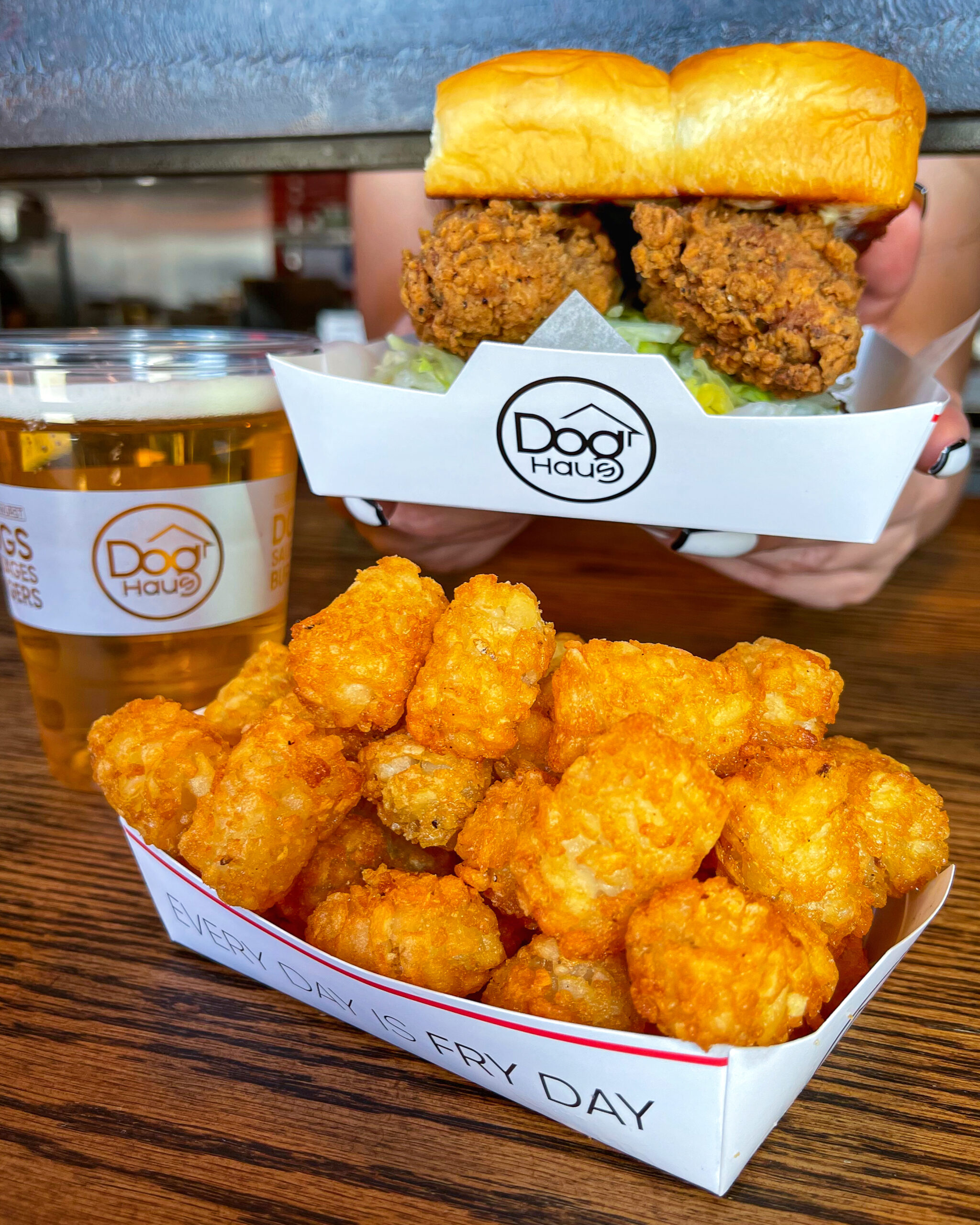 Dog Haus creates hand-crafted hormone- and antibiotic-free hot dogs, sausages, burgers, fried chicken creations, breakfast burritos and plant-based protein items, all served on King’s Hawaiian rolls. Crush one, then wash it down with one of our local craft beers or signature cocktails.